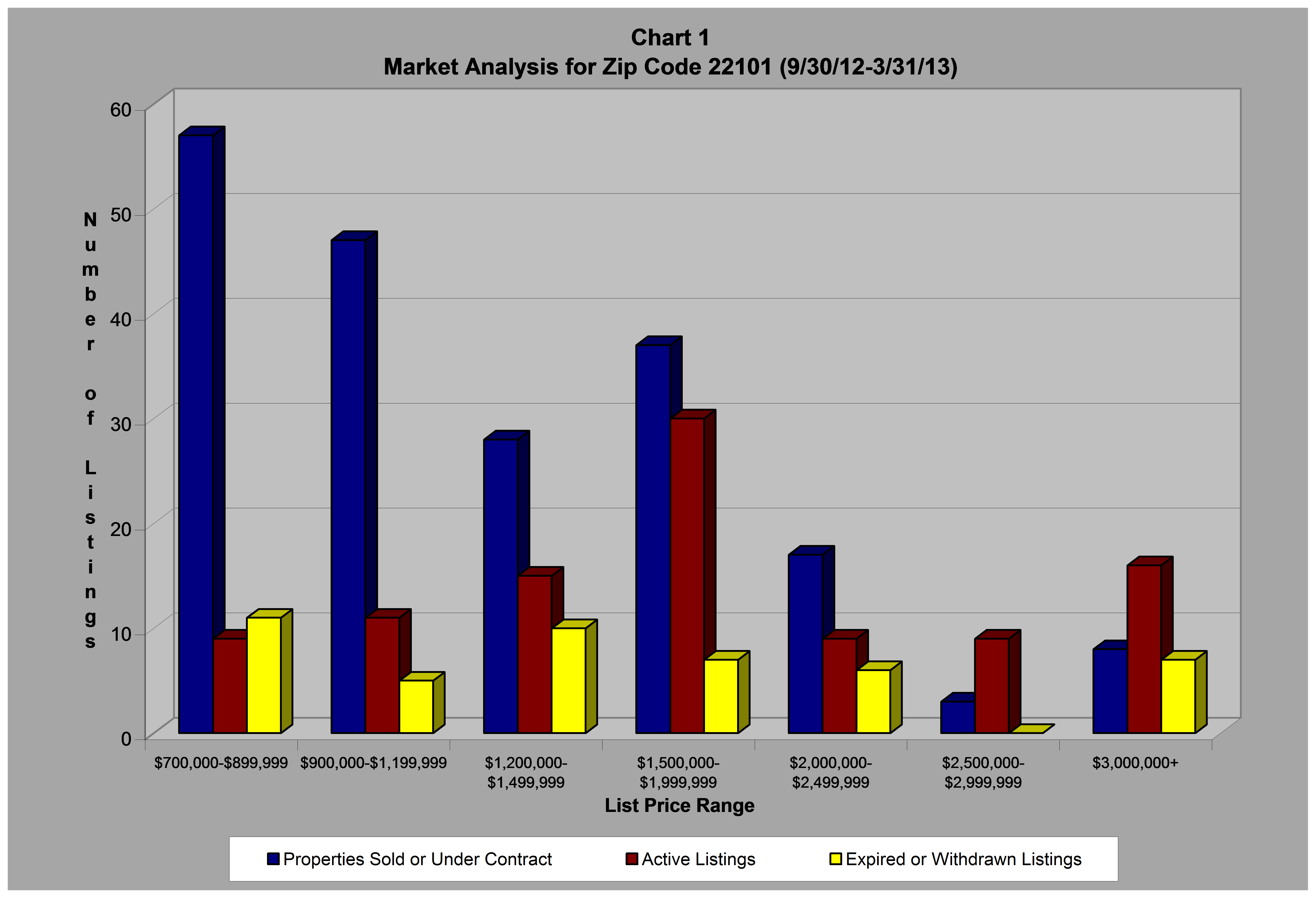 The following table and chart compare the number of active listings (the supply) to the number of properties sold or under contract (the demand) in the local real estate market of McLean, VA for zip code 22101 by price range for the period from 9/30/12-3/31/13.